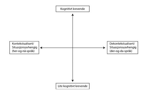 Pedagogen Jim Cummins er opptatt av skillet mellom kontekstavhengig og kontekstuavhengig språkbruk, samt skillet mellom kognitivt krevende og kognitivt enkel oppgave. Han har utviklet figuren som går under navnet Cummins kvadrat, og som vi ser, kan dette kvadratet fange opp disse forskjellene i kommunikasjonssituasjonen (Cummins 1984):