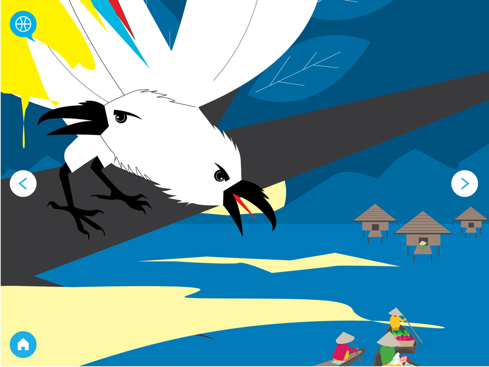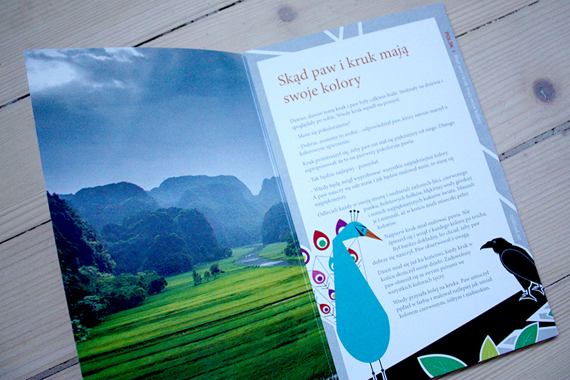 Esken inneholder et illustrert hefte med eventyrteksten på norsk (bokmål eller nynorsk) eller samisk (lulesamisk, sørsamisk eller nordsamisk). På innsiden av eventyrheftet er et naturfoto fra Vietnam. Fotoene kan fungere som kulisse i fortellestund, og i lek og dramatisering av eventyret sammen med eventyrkarakterene.